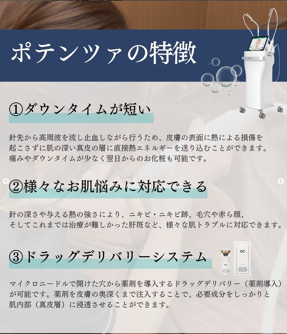 ポテンツァは、微細な針と高周波(RF)を組み合わせた治療。針で肌に微小な穴を開け、RFエネルギーでコラーゲンやエラスチン生成を促進。ニキビ跡、毛穴の開き、たるみ、小じわに効果的です。薬剤導入を組み合わせることで、さらに美肌効果が高まります。