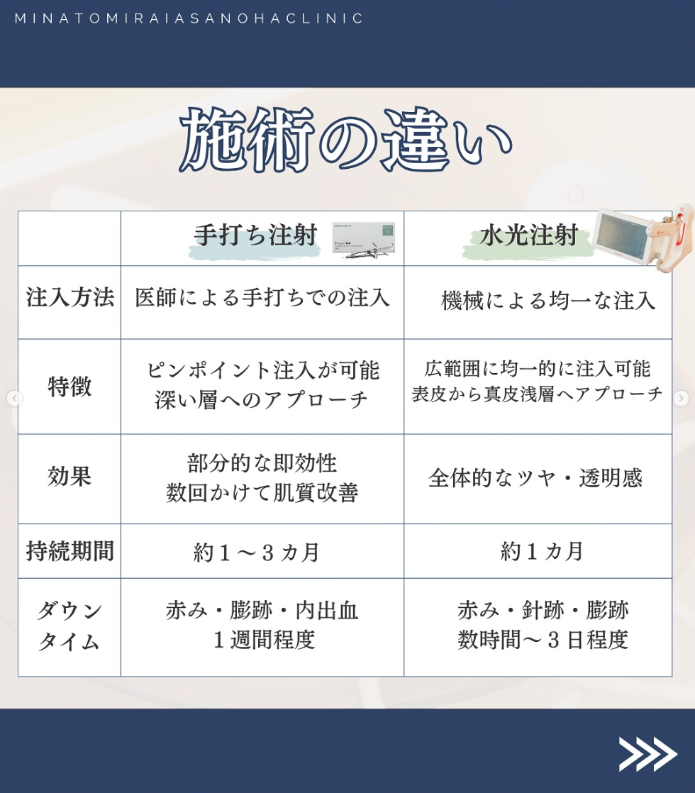 手打ち水光注射は、ヒアルロン酸やビタミン、成長因子などの美容成分を、医師が手作業で肌の浅い層に細かく注入する施術です。肌のハリ、潤い、透明感を高め、全体的な肌質改善を目指します。
