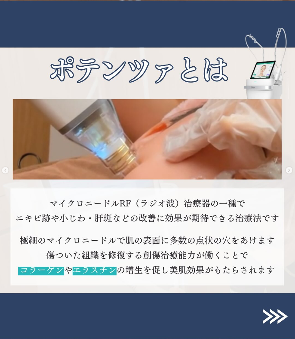 ポテンツァは、マイクロニードルと高周波(RF)を組み合わせた施術で、肌の深層に熱エネルギーを届け、コラーゲン生成を促進します。ニキビ跡、毛穴の開き、シワ、たるみの改善に効果的です。