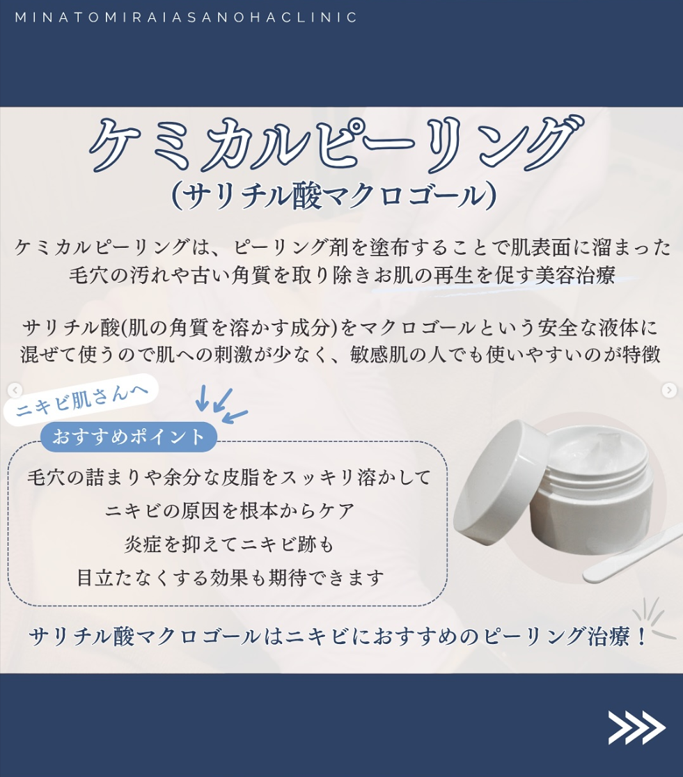 みなとみらい麻の葉クリニックでは、マッサージピールとハイドラブースターのみの取り扱いですが、今後はピーリング製剤を増やしていく予定なのでお楽しみに!