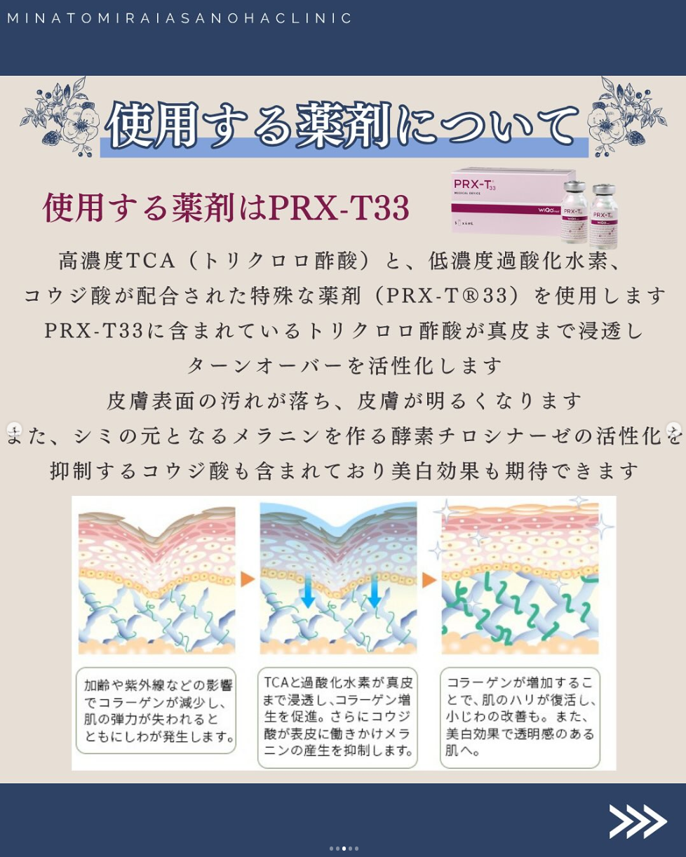 - 成分:トリクロロ酢酸(TCA)+アミノ酸+ビタミン類(グリシン、アルギニン、ビタミンCなど)
