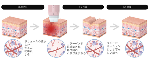 ボルニューマは、韓国発の先進RF機器で、真皮層から脂肪層まで高周波エネルギーを均一に届けます。電子レンジのように分子を振動させて摩擦熱を生み、皮膚内部を温める仕組みです。この熱がコラーゲン繊維を収縮させ、即時引き締め効果を発揮。一方、線維芽細胞を刺激して新しいコラーゲンやエラスチンを生成し、数週間後からハリ感がアップします。