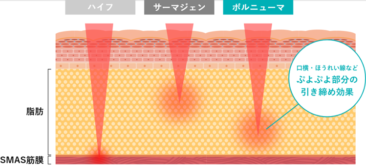 小顔効果のポイントは、脂肪層の浅部をターゲットに「ゆるんだ輪郭」をキュッと引き締めること。ほうれい線や二重あご、フェイスラインのぼかしを自然に改善。加えて、毛穴引き締めや肌質向上も同時に叶うので、トータルビューティーが狙えます。ハイフ(HIFU)と組み合わせると、深い筋膜層までアプローチでき、さらにパワフルなリフトアップが可能に。