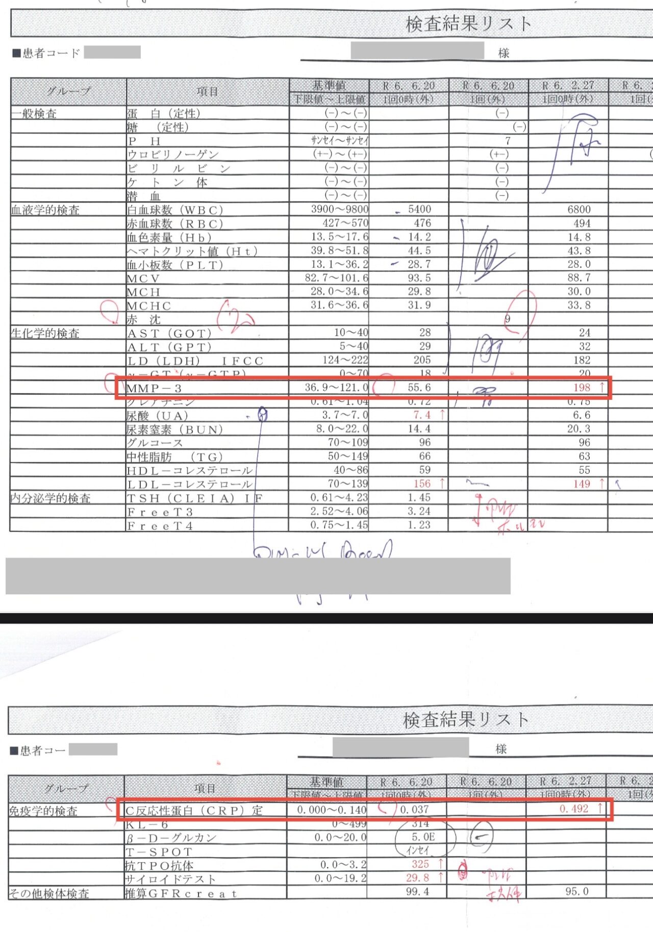 2024年6月から2025年1月にかけて、計4回の幹細胞上清液の静脈点滴投与を行いました。驚くべきことに、1回目の点滴投与後から「体調がすこぶる良い。手関節がパンパンに腫れることもなく痛みもなくなった」という感想をいただきました。客観的な評価指標として、関節リウマチの活動性を反映するMMP-3という数値を測定したところ、治療前の2024年2月には198であったものが、2025年6月には55.6まで低下していました。また、炎症反応を示すCRPも0.492から0.037へと著明に改善しており、検査データからも明確な治療効果が確認できました。