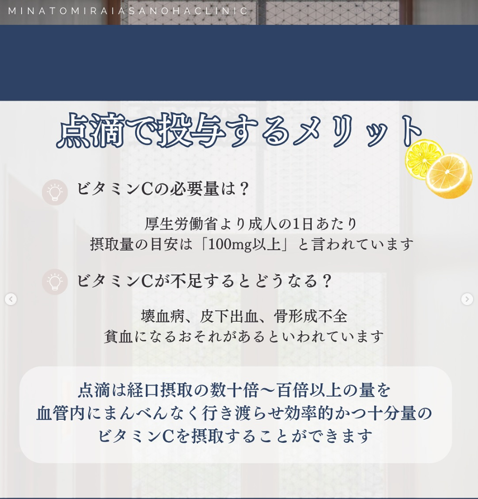 💉4. 高濃度ビタミンC点滴・美容点滴:内側から“元気と美”を補給