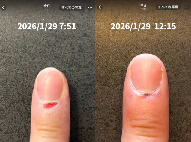私自身、この上清液の効果を身をもって体験したエピソードがあります。先日、診療以外の作業中に不注意で指先に深い切り傷を負ってしまいました。出血も伴い、通常であれば治癒までに数日を要し、しばらくは痛みに悩まされるような怪我でした。